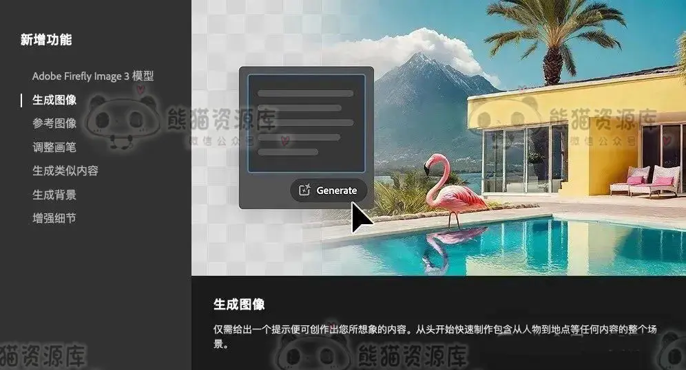 生成式扩展(技术预览)使用“裁切”将照片扩展到原来的尺寸之外。使用 Adobe Firefly 填充照片周围的透明区域。