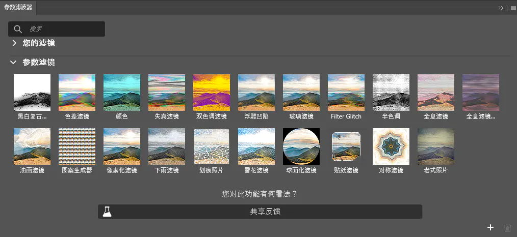 包含21种强大的滤镜效果,每种效果都是不同的艺术风格,也可以直接吸附或折叠到任意窗口,独立窗口方便使用。目前正式版的PS 2025还没有这个功能,只有Beta版才有!